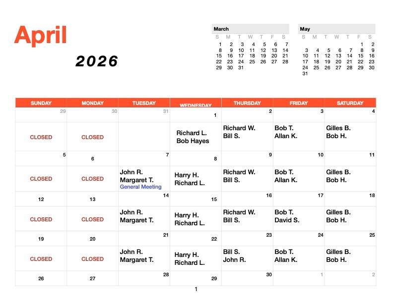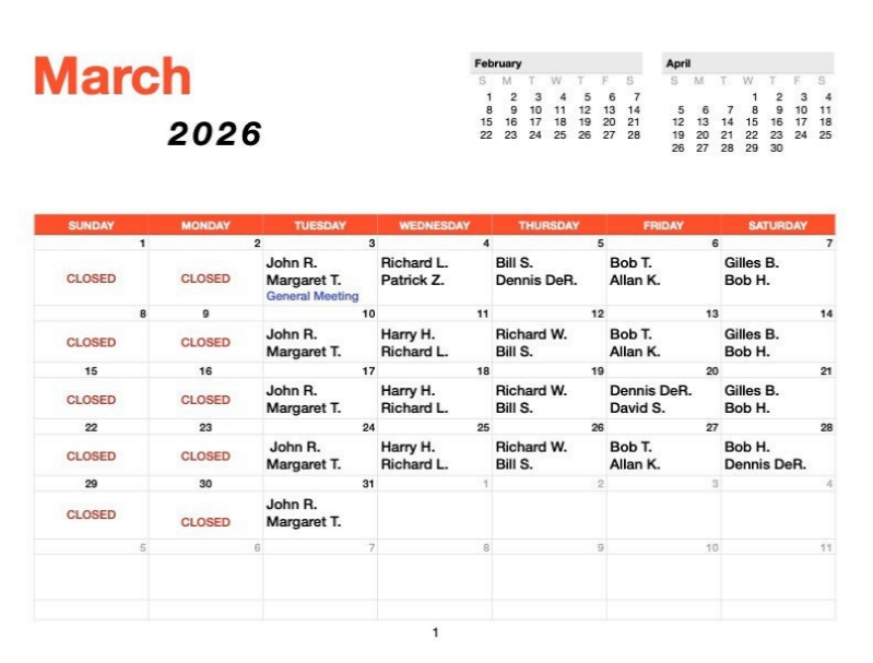 The monthly schedule of Volunteers at the Veterans Museum And Education Center.